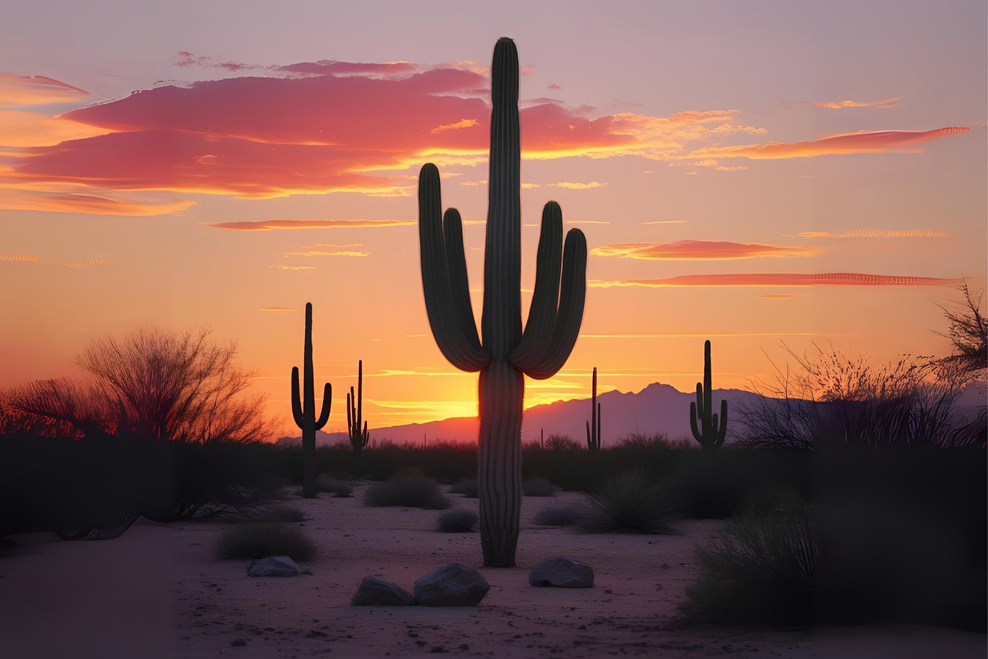 A single saguaro catches the final light in Cactusgold Dusk, its silhouette outlined by a glowing desert sky. Poised, grounded, and bathed in warmth.