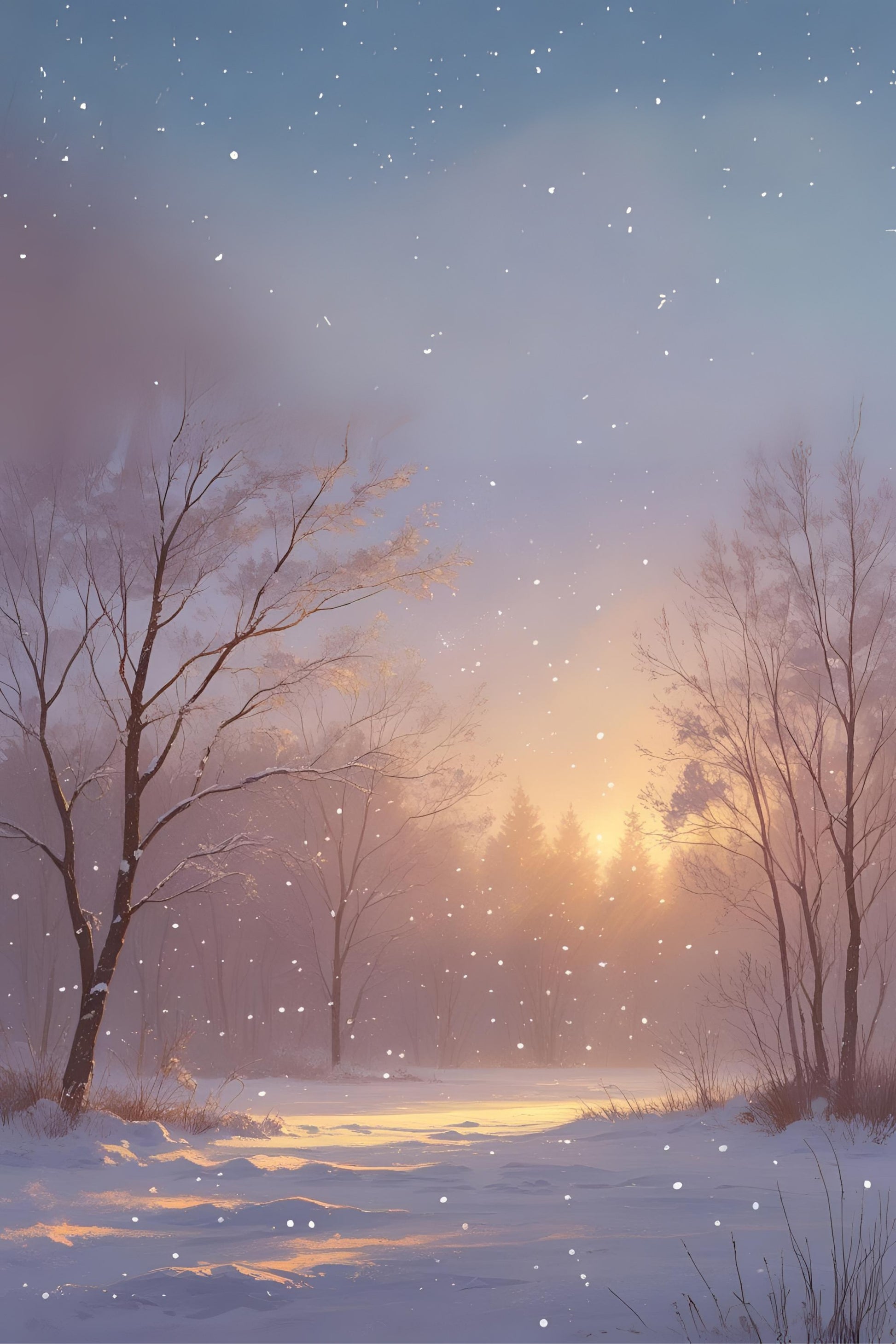 As flakes continue to fall, Driftfall Light captures the golden glow of late afternoon through the soft haze of snow. Warmth and winter meet in quiet harmony.