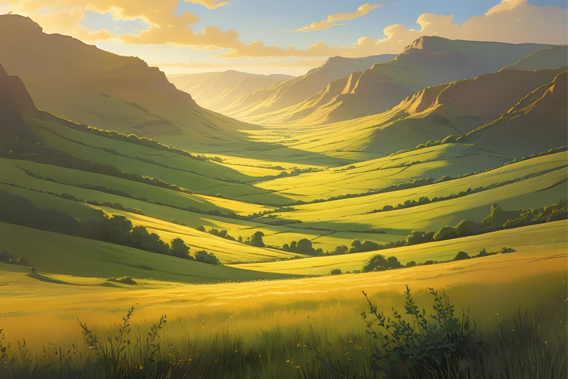 Golden Fold Meadow features layered fields touched by late sun — each fold of land glowing softly, each curve resting in the next. An ode to nature’s rhythm
