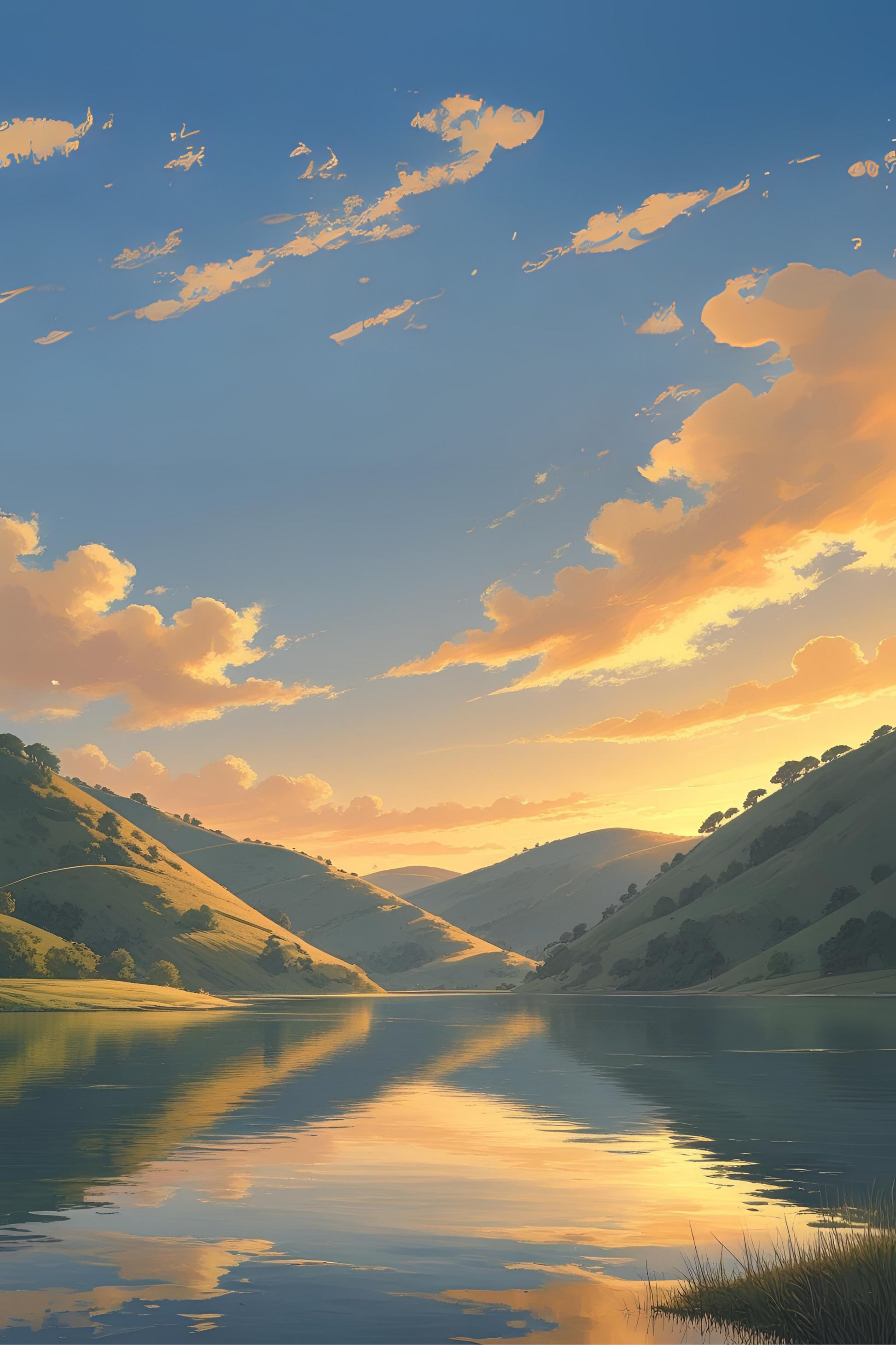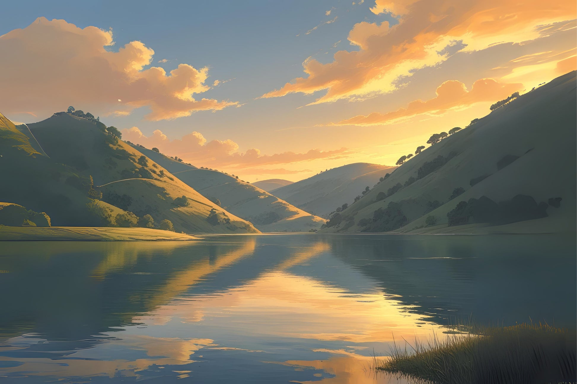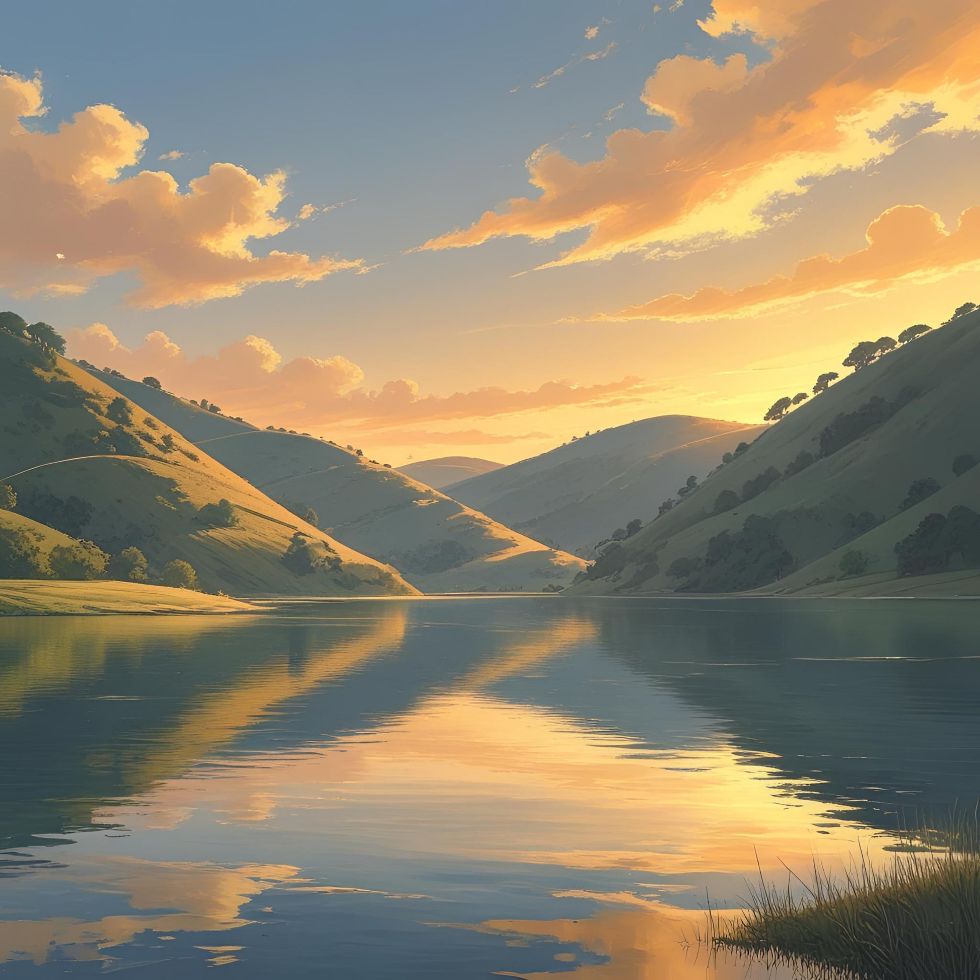 Soft hills surround a quiet lake in Hollowlight Reflection, where the water becomes a canvas for golden light and peaceful skies.