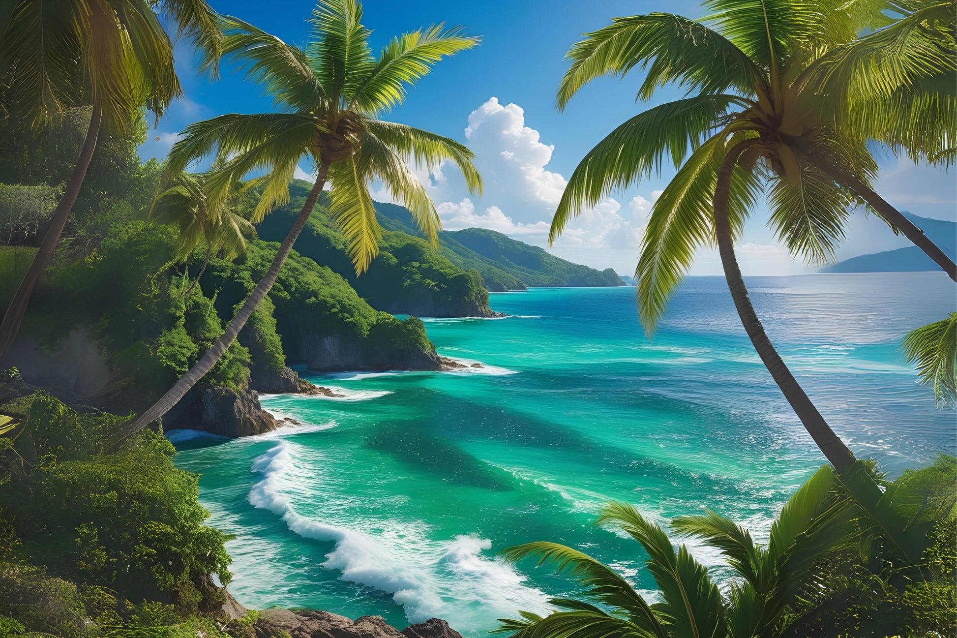 In Mango Bay Breeze, vivid colors and sweeping palms paint a tropical dreamscape. Light plays across the water, carried gently by the wind.