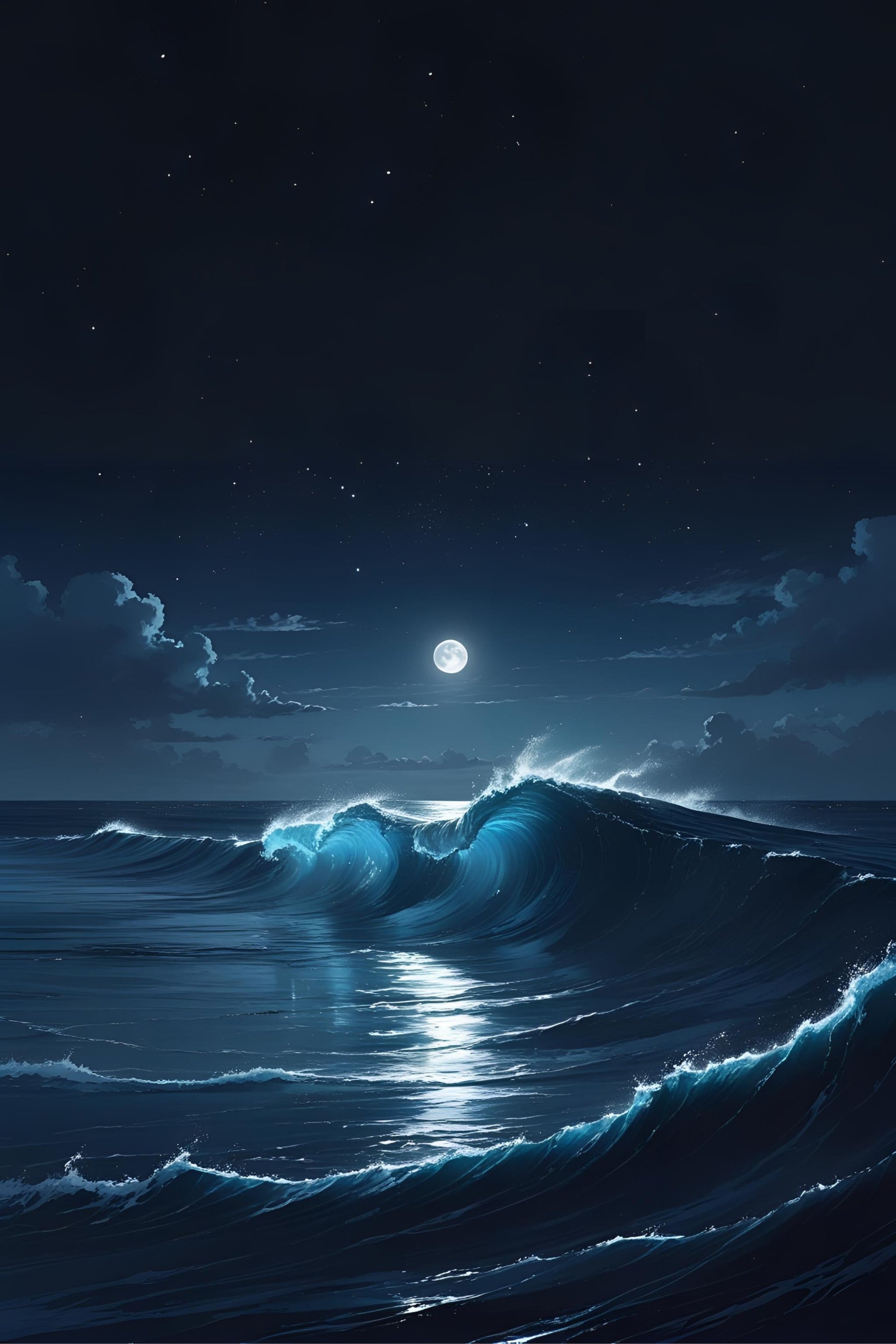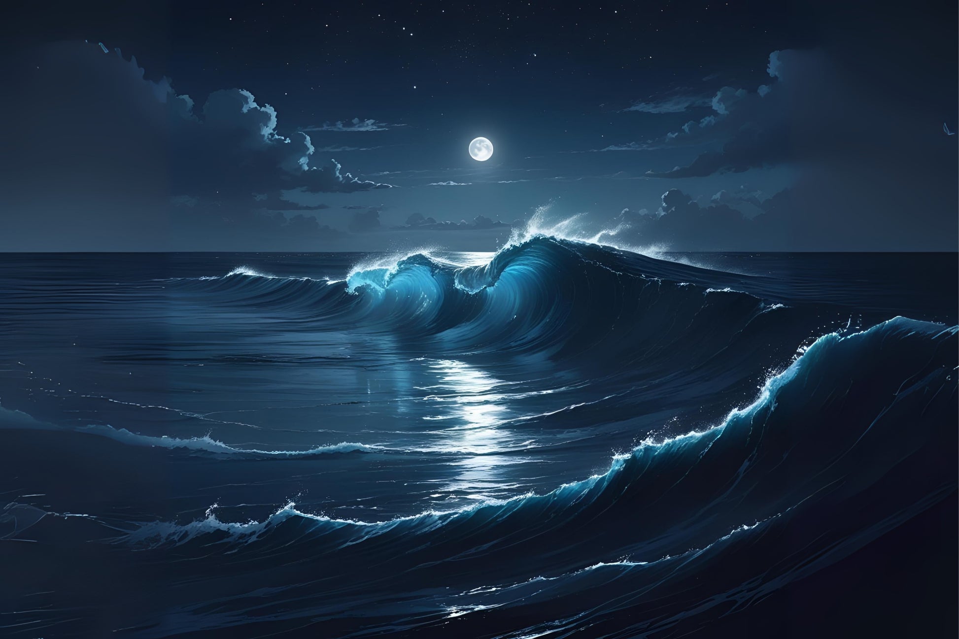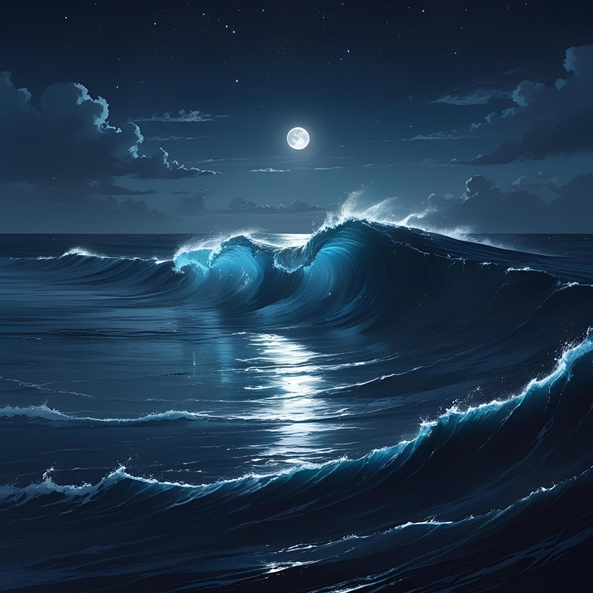 Midnight Crest dives into the mystery of the ocean at night — deep tones, dramatic highlights, and the shimmer of moonlight glancing off a single rising swell.
