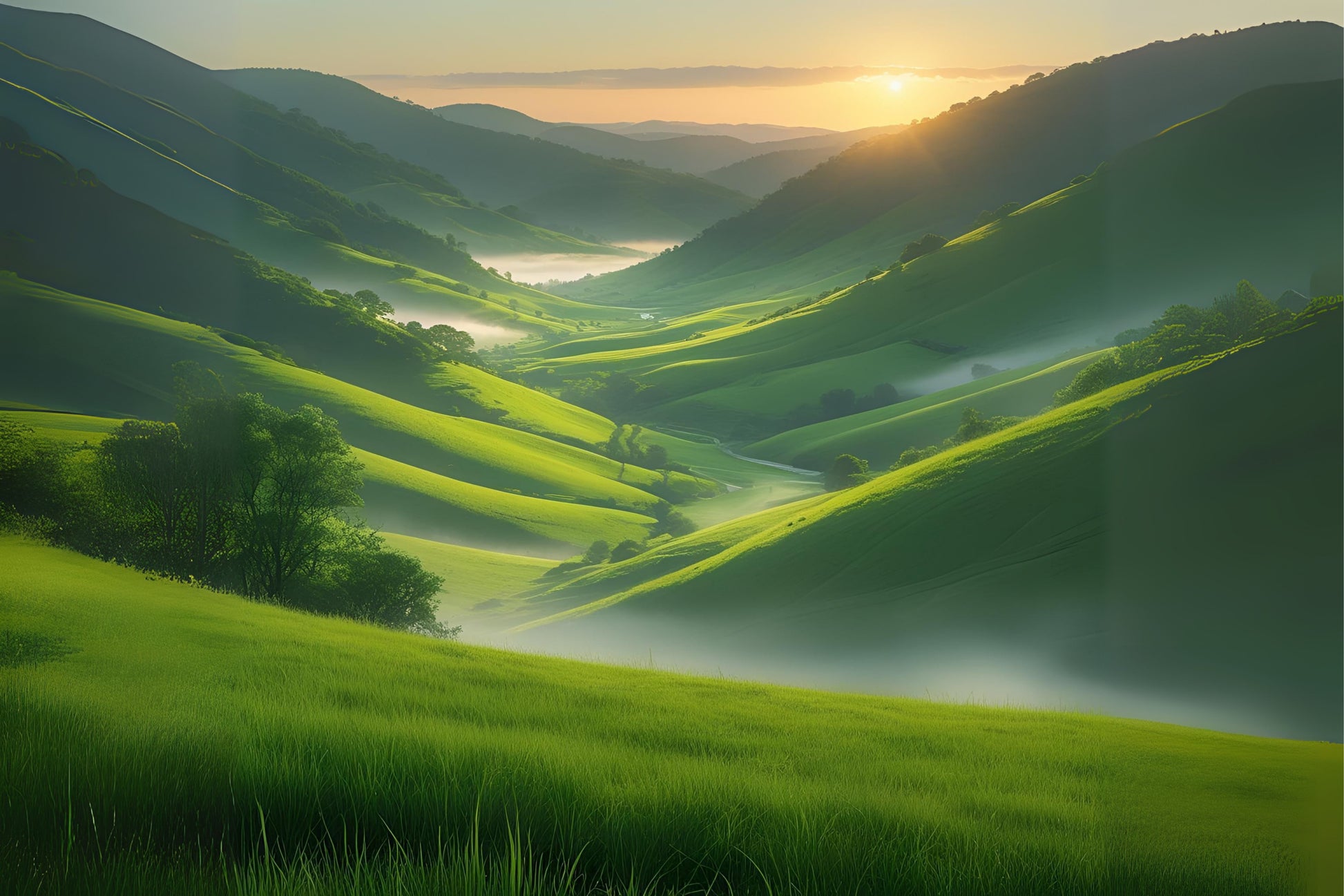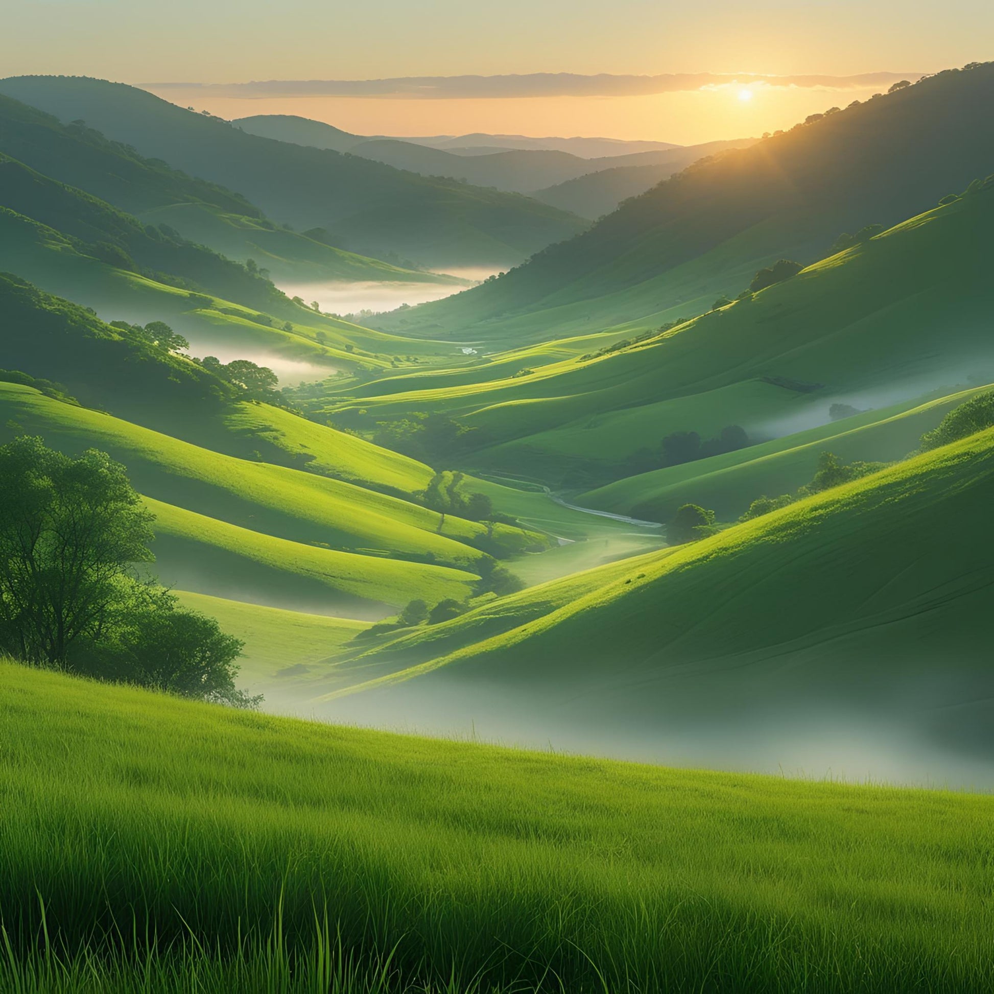 Soft light moves gently across a dew-covered valley in Morning Sweep Glen, where every curve feels fresh and full of possibility.