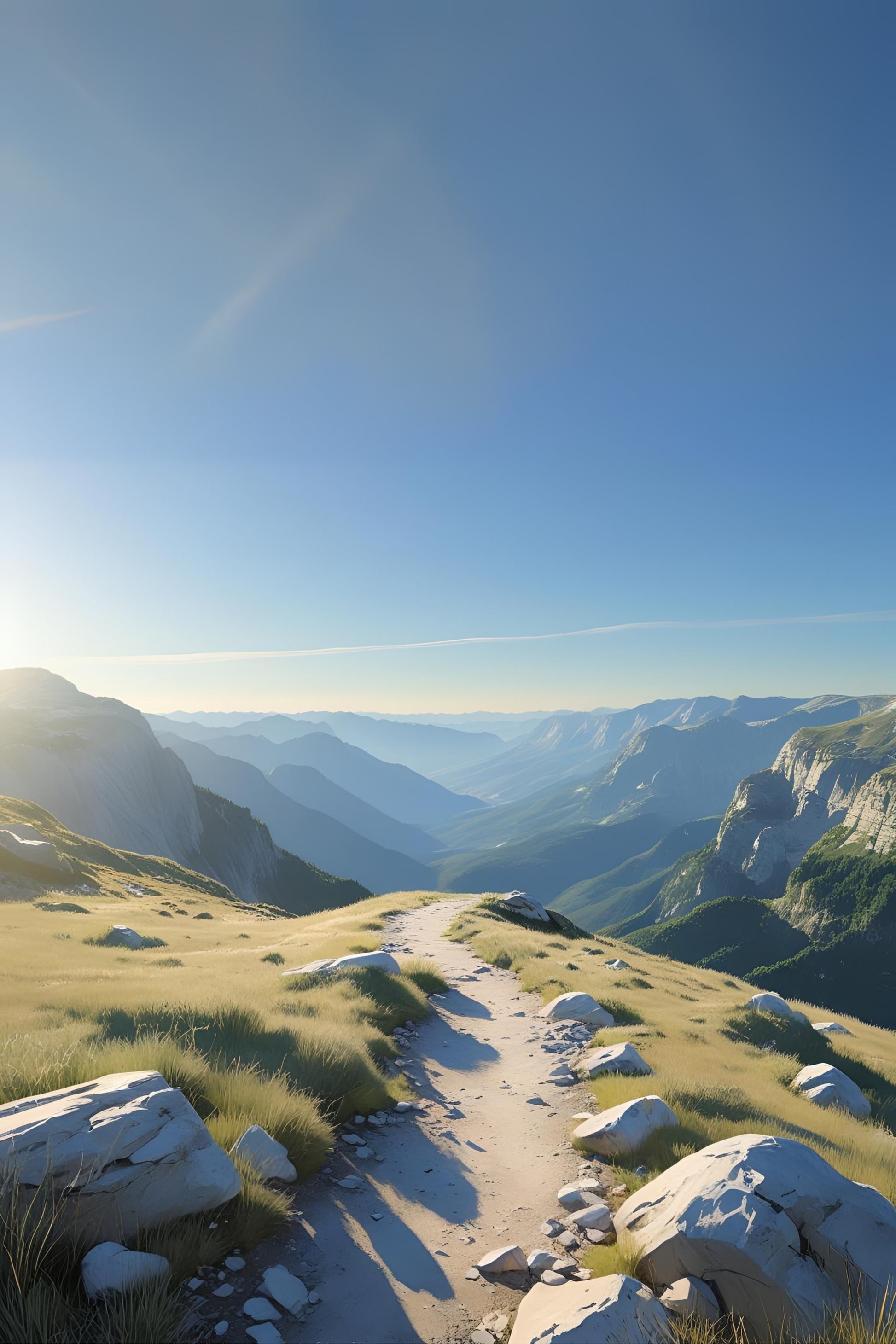 A narrow trail winds gently along a sunlit ridge in Ridgepath Calm. Each step feels steady and serene, surrounded by sky and endless views.