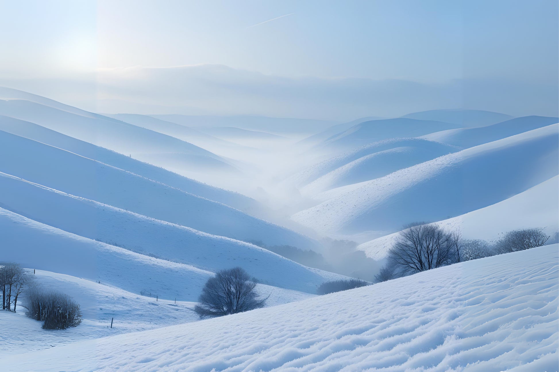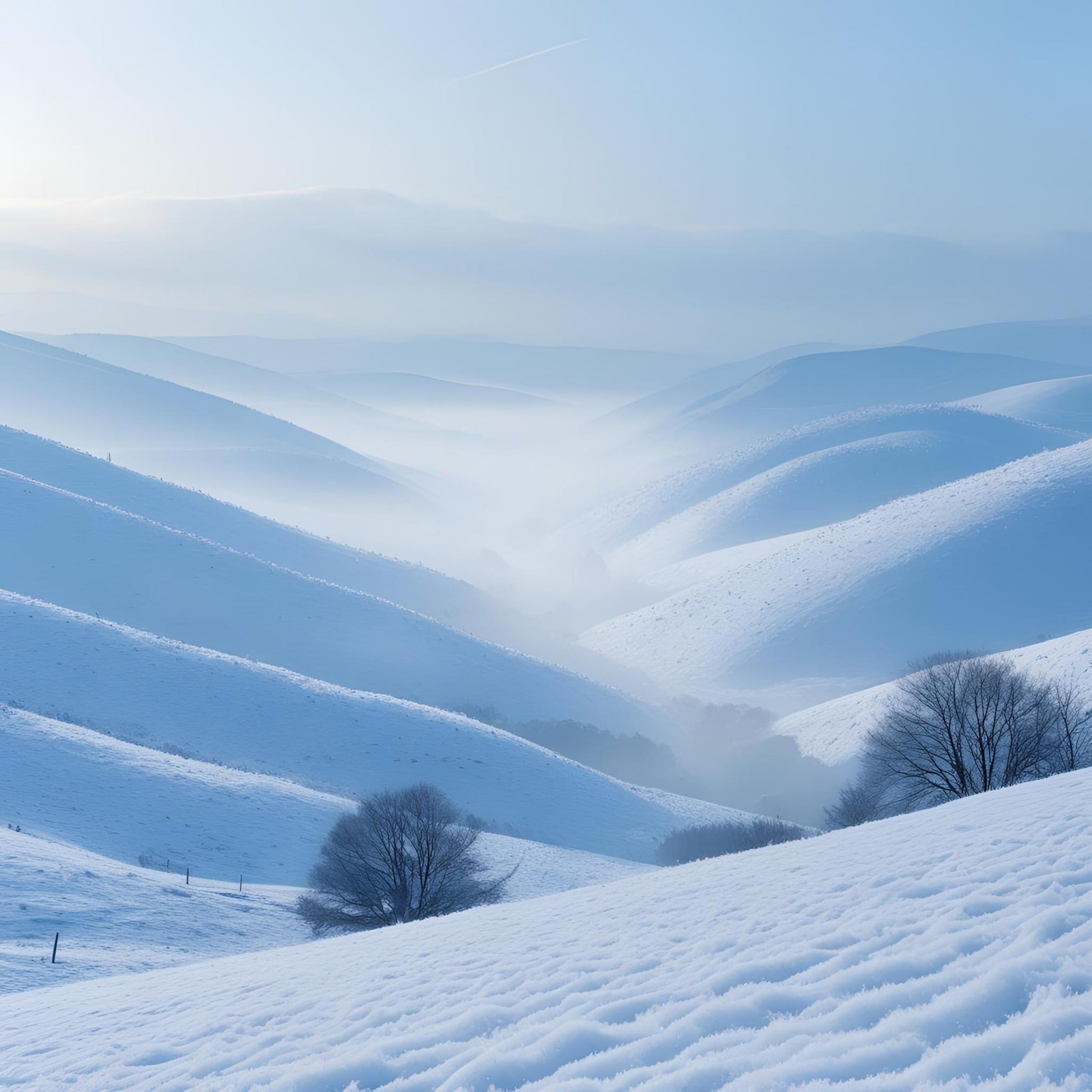 Silent Flurry Rise follows a soft snowfall rising over distant hills, where quiet white slopes blend gently into a pale morning sky.
