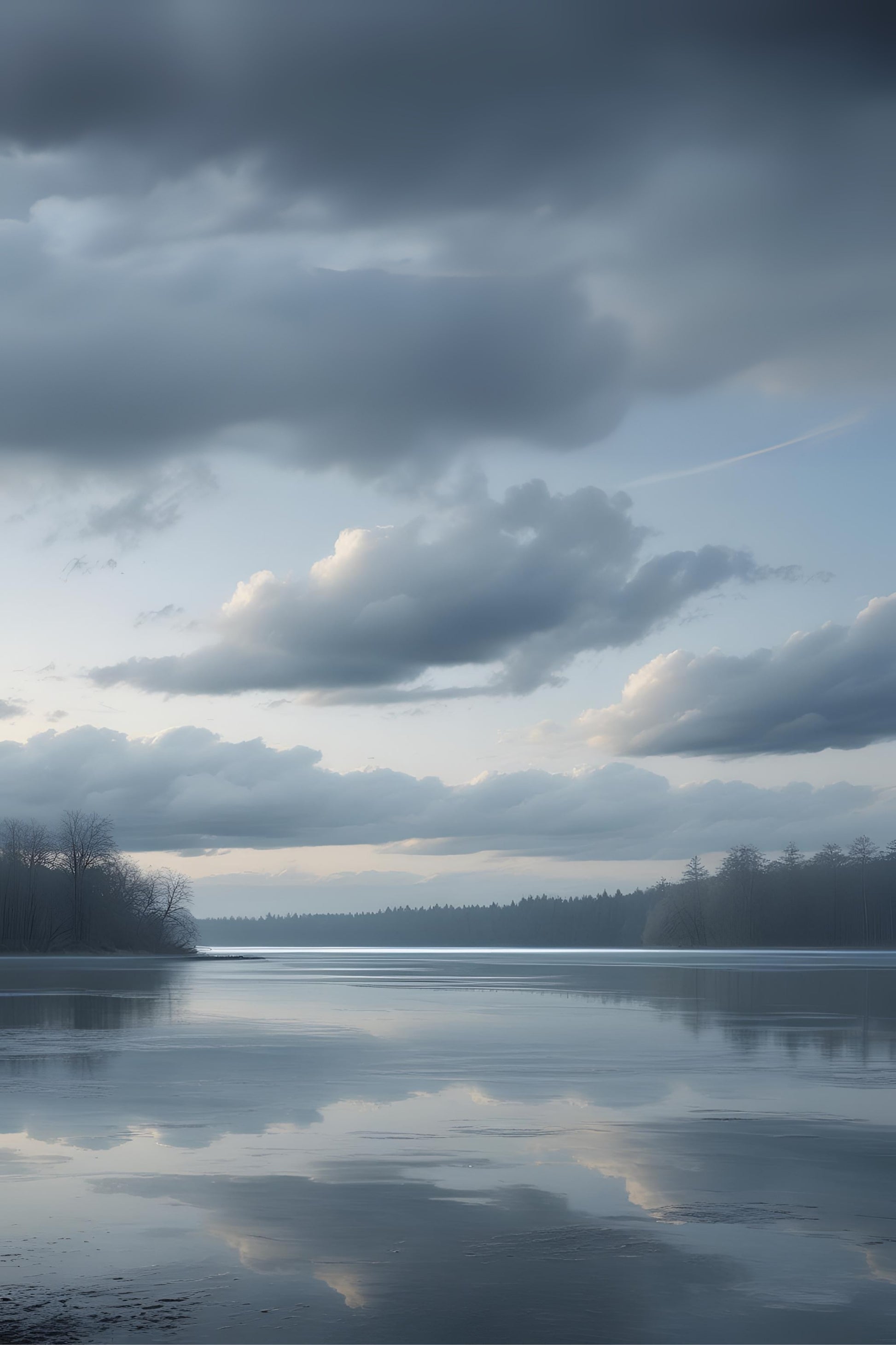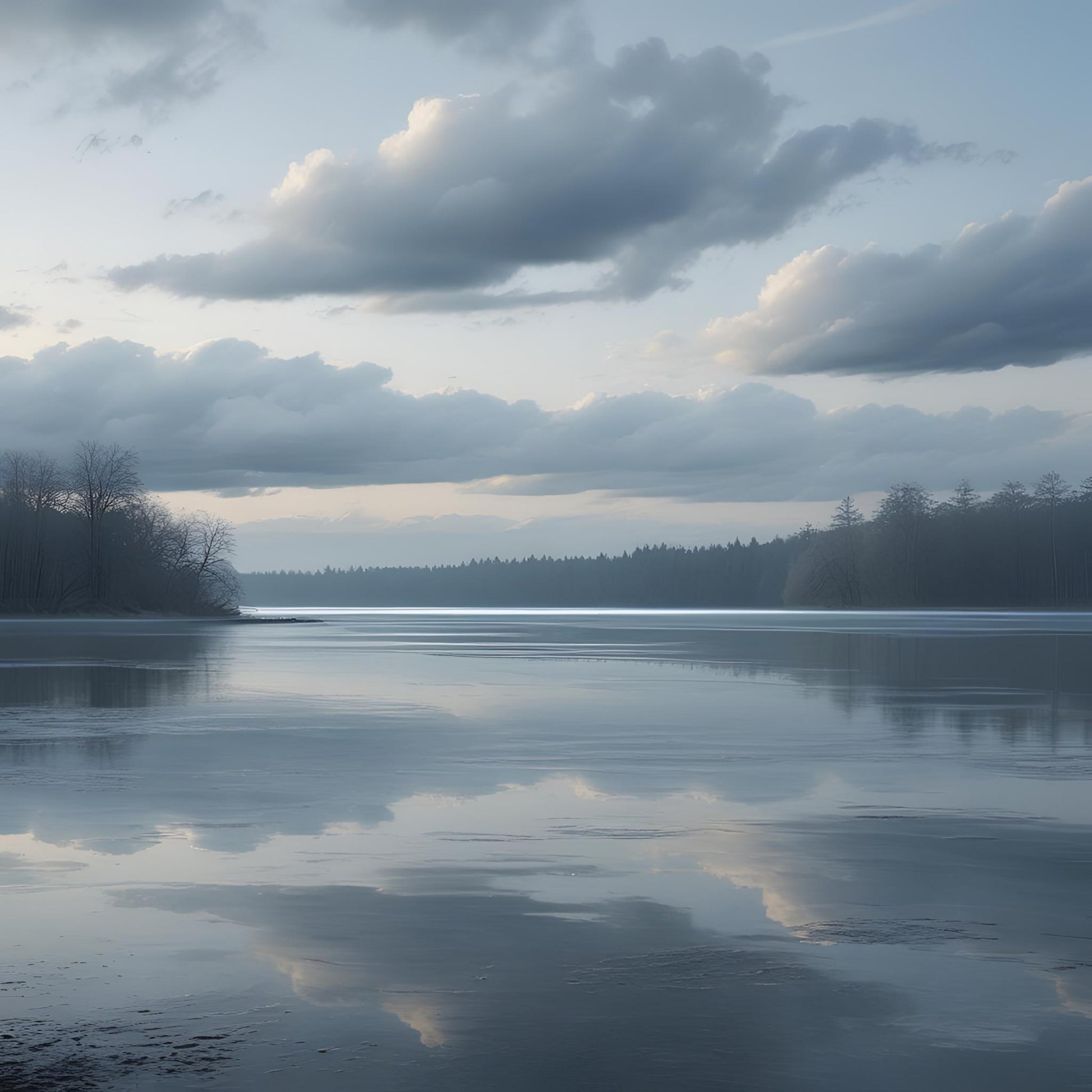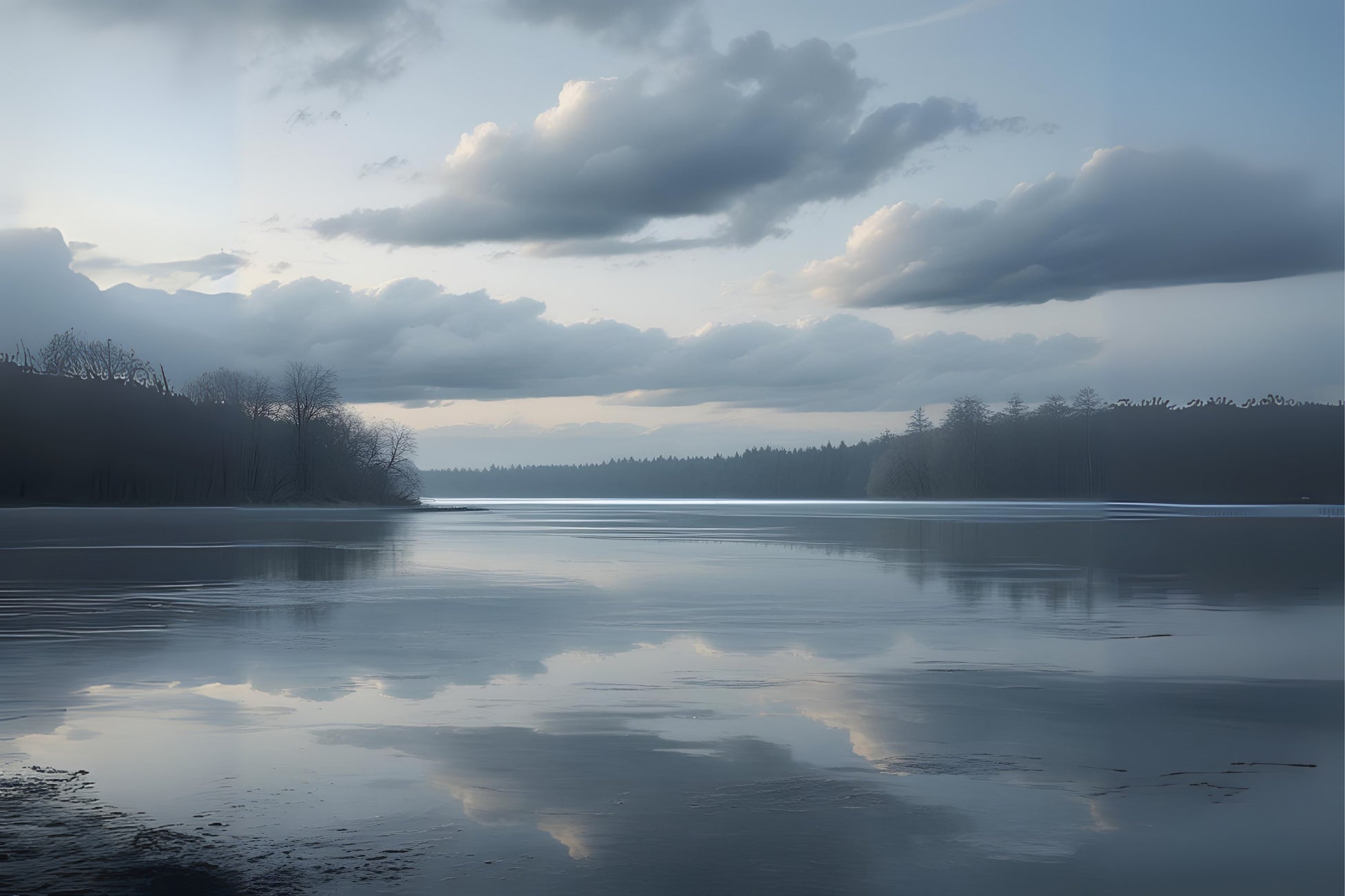 In Silverlake Quiet, a cool-toned palette and cloud-filtered light transform the lake into a sheet of polished silver. Balanced, minimal, and profoundly peaceful.