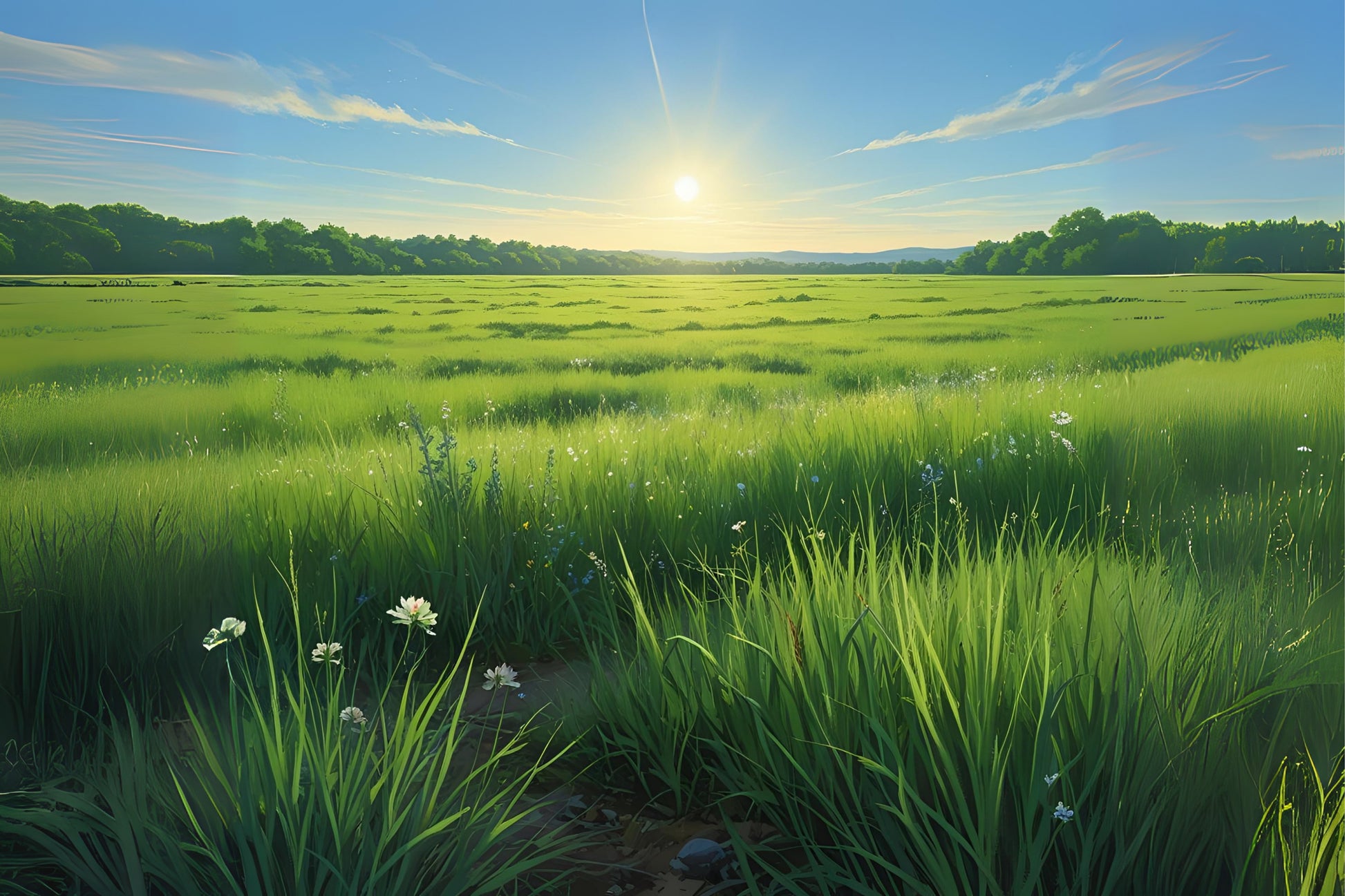 Softfield Shine captures the gleam of light on fresh summer grass, where sun meets stillness in a luminous, open field.