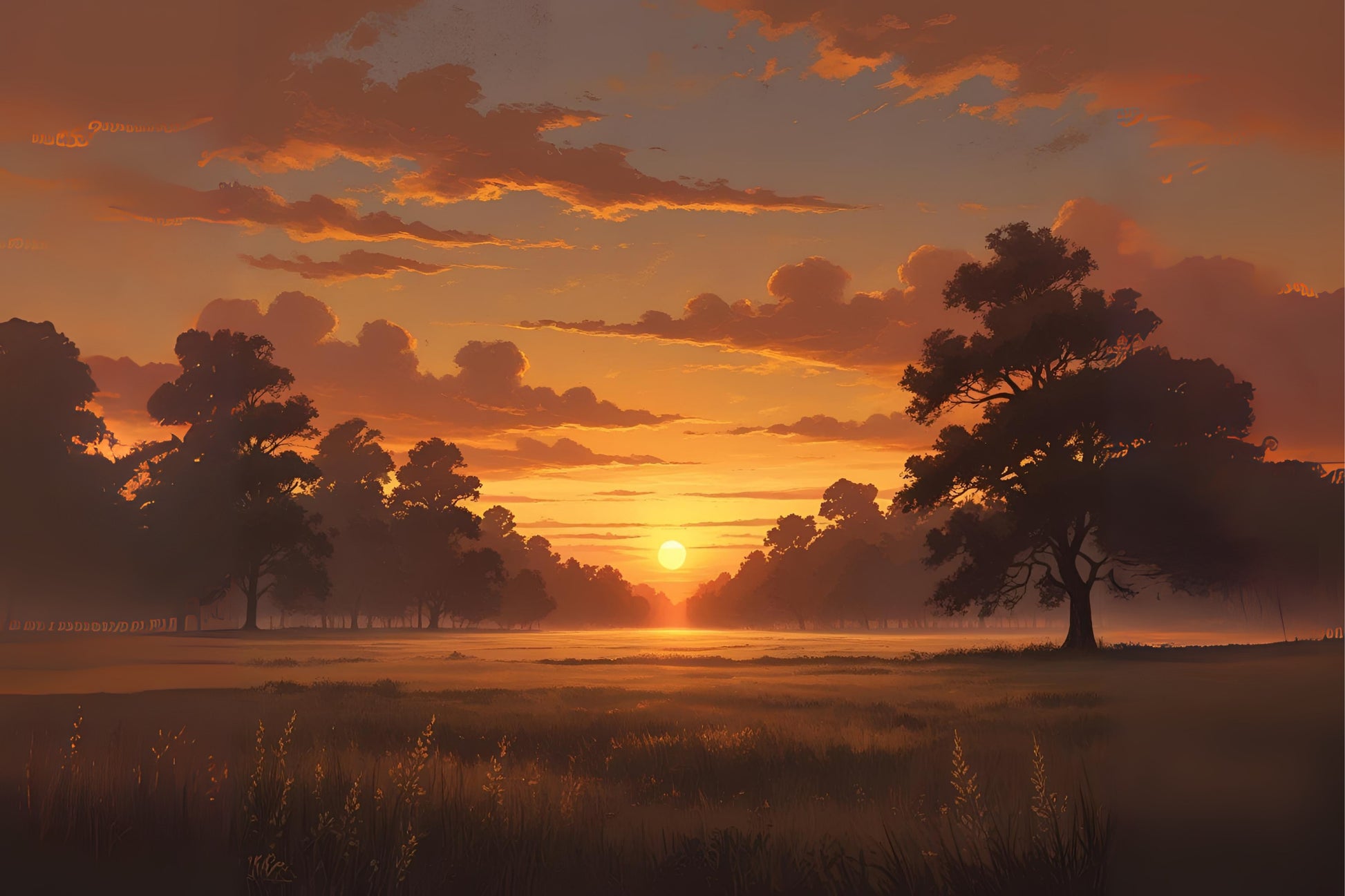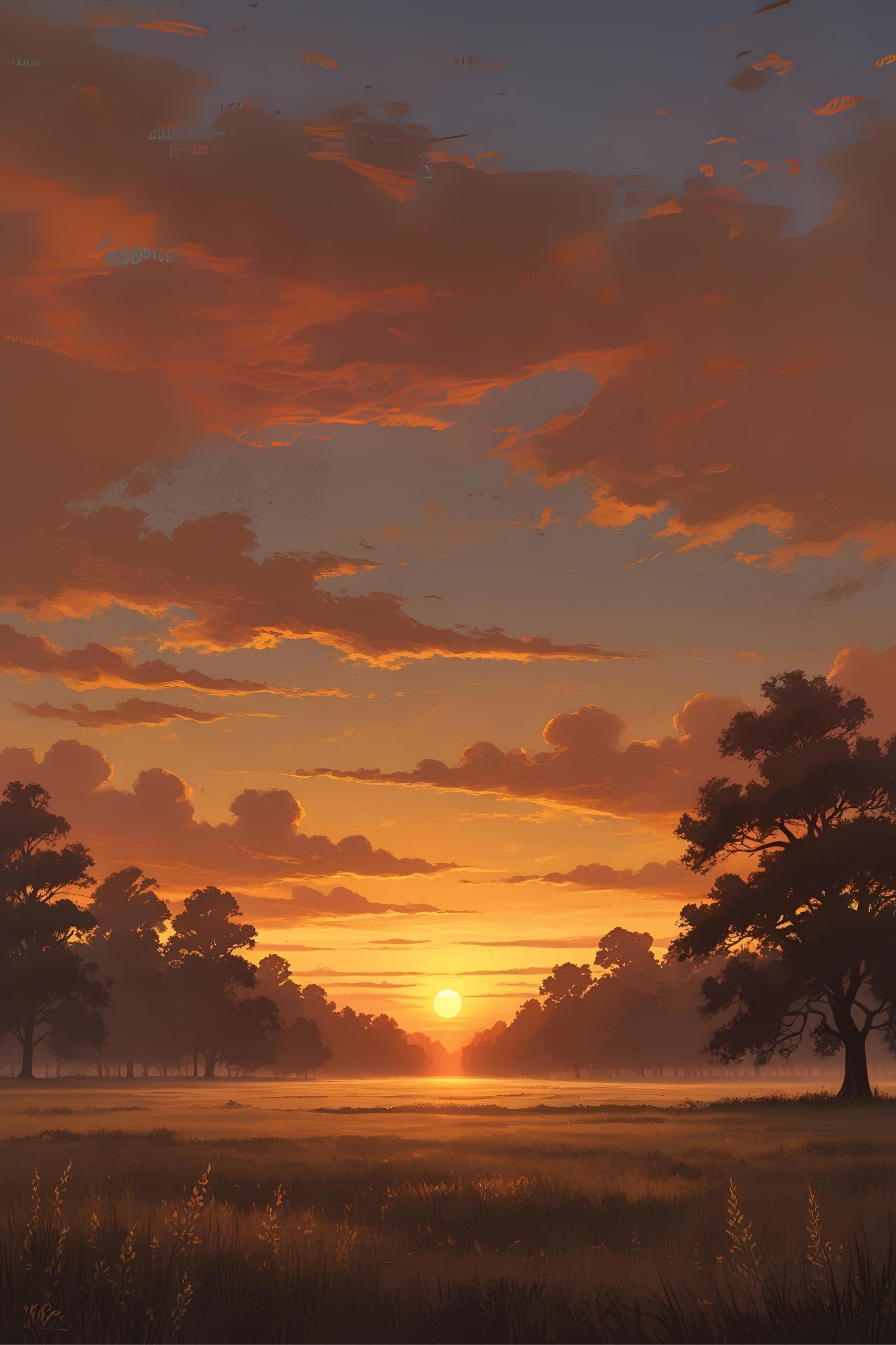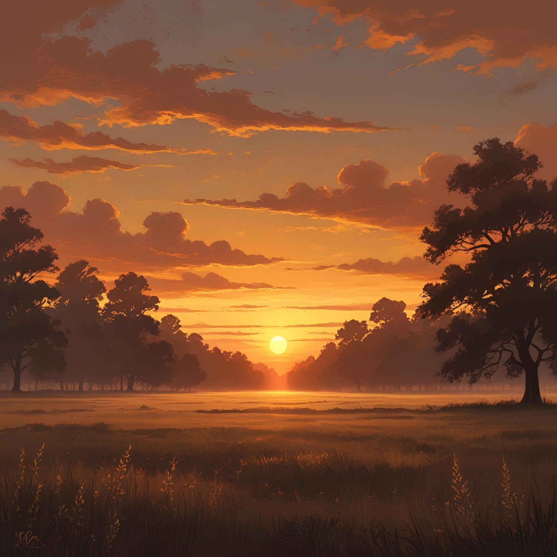 In Solstice Drift, the longest light of day lingers above a quiet treeline. The sky glows in molten gold and soft firelight hues, holding the warmth of a summer’s end.
