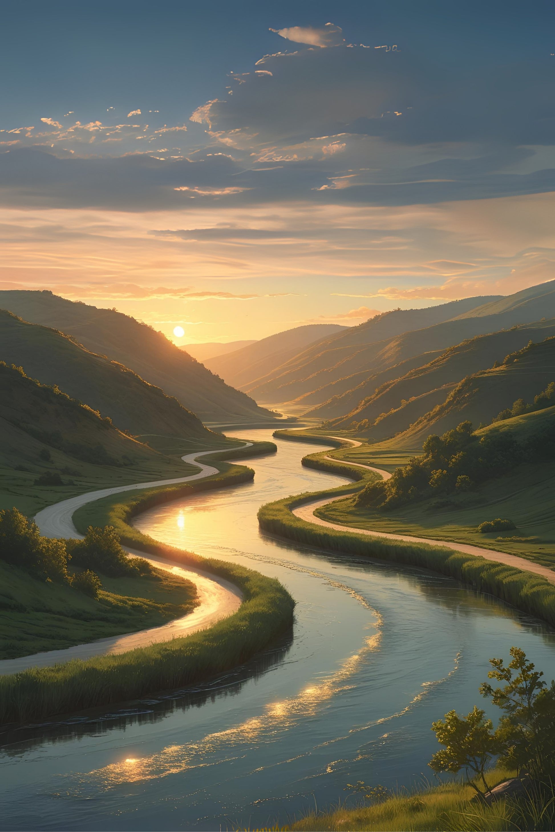Sunquiet Bend captures the last rays of daylight slipping across a soft riverbend tucked between hills. A golden glow, perfectly still.