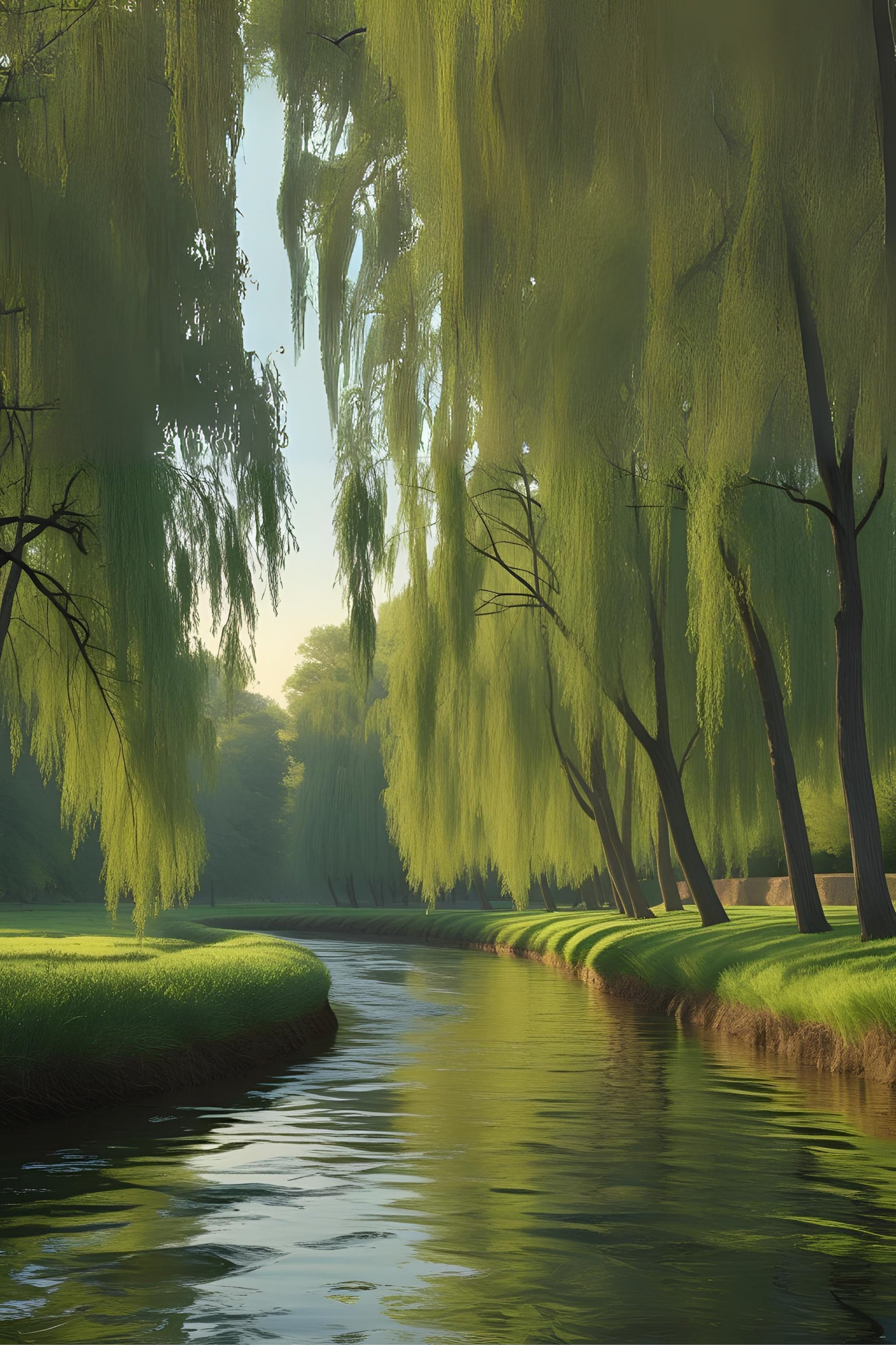 In Willowbend Current, a slow-moving river bends through overhanging willows, their reflections swaying softly in the gentle flow. A perfect harmony of movement and stillness.